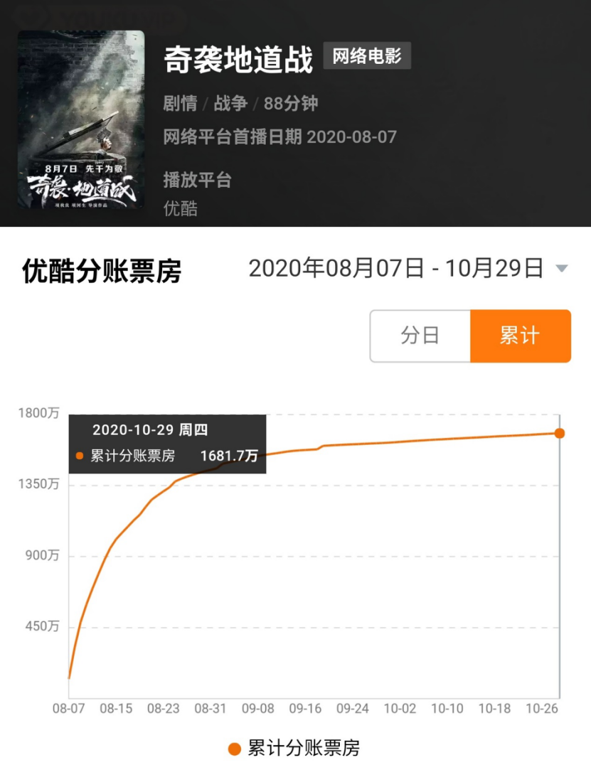 以展现抗日战争的作品《奇袭地道战》为例,本片由项氏兄弟电影、兔子洞文化、优酷联合出品,8月上线后,影片的累计分账票房已经突破了1680万。为了呈现出主旋律题材的最佳水准,《奇袭地道战》邀来了网络电影界的知名导演项氏兄弟执导,与以往一些其他类型网影不同,《奇袭地道战》从筹备到上映耗时一年半时间,正所谓慢工出细活,在栗坤看来,对于这样一部电影来讲,充分的制作时间是完全有必要的,影片除了要拍得好看外,还承担了一定的社会责任。