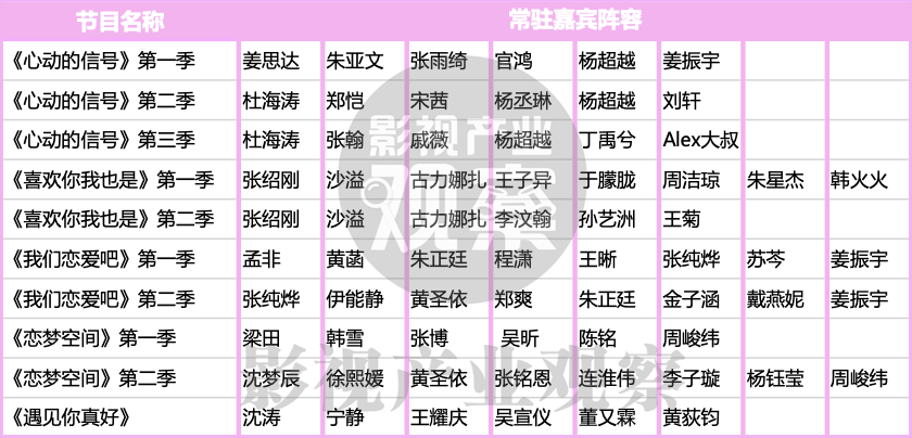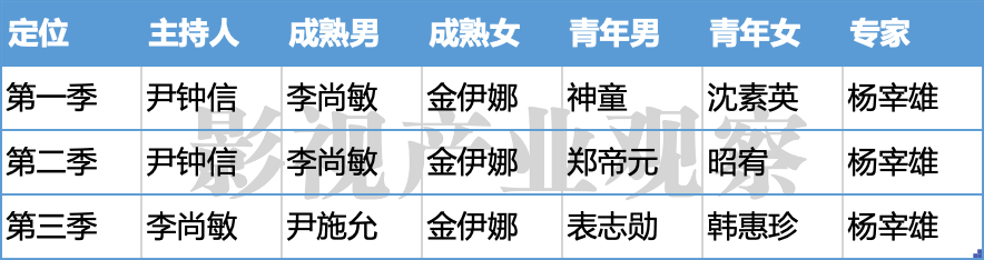 由此可见,主持人+成熟男女+青年男女+专家的六人基本配置,在很大程度上能够保证节目拿到及格分,国内恋爱推理综艺大部分在搭配观察阵容时,都遵循了这一法则或在此基础上进行了微调。以播出三季的《心动的信号》为例,虽然每季的成员都进行了大换血,但基本还是“一个萝卜一个坑”的配置。