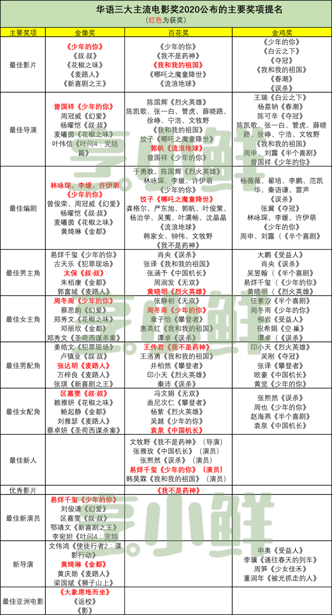 结合金鸡奖,本年度举办的大多数华语电影奖(非电影节类)已揭晓了认可的片单。对此,我们统计了三大主流奖——香港电影金像奖、大众电影百花奖、中国电影金鸡奖的终极入围名单,以此观察近两年的行业情势。尽管它们的参评范围各有不同,但是其共性仍能说明主要现象。
