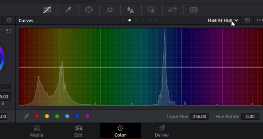 直方图中的信息直接表示查看器中的内容。在这个示例的镜头中,有大量的红绿色和蓝色,如曲线图所示。因此,如果要调整蓝色饱和度,可以在尖峰周围设置两个控制点,然后增加或减少该色调。或者,我们可以移至预览监视器上,然后会出现一个采集吸取工具。选择图像中的任何色相后,相应的控制点将出现在曲线图中,从而进行更精确的调整。我们可以在一条曲线上,在一个节点上全部增加绿色饱和度,同时降低蓝色饱和度。