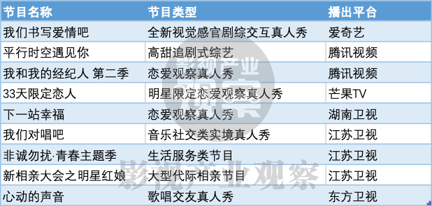 爱奇艺引进原版模式《我们书写爱情吧》,三组搭档产出的剧本将由演员本人或新锐演员倾情演绎,与真人秀交叉套播。腾讯视频高甜追剧式综艺《平行时空遇见你》已经官宣李一桐、秦岚、杨超越、侯明昊、刘以豪、王彦霖加盟,三组搭档将分别自主创作偶像剧剧本并进行演绎。芒果TV《33天限定恋人》则邀请四对明星荧幕情侣,从戏里走到戏外,展开33天的真实生活,最终留一封信进行告白。