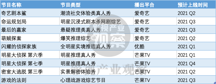 从2016年引进JTBC《犯罪现场》打造《明星大侦探》以来,芒果TV在国内悬疑推理领域一直保持着领先优势,而爱奇艺、优酷也将入局这一赛道,明年共计推出近十档悬疑推理类节目,贯穿Q1到Q4。