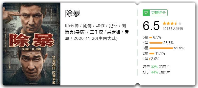 此外,受影片时长所限,《除暴》中虽不乏酣畅淋漓的打斗戏,但在不到90分钟的时间里,主角一直处于被剧情推着走的状态。作为导演的刘浩良在情感和细节上疏于铺垫,导致一些情节逻辑经不起推敲,比如关于刑警如何迅速知道作案的团伙为老鹰帮、老鹰帮如何处置抢劫来的巨额钱财等诸多问题都缺少下文,在沉浸于主演过硬的演技和美好的肉体之余,剧情铺垫和衔接部分反而成为《除暴》的软肋,这也进一步导致影片在上映后口碑表现一般,在豆瓣上,《除暴》仅收获6.5分的及格分。