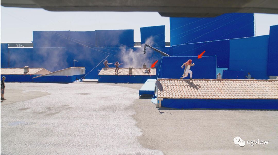 从视频00:36镜头从屋内摇出室外一直跟在Mera那部分开始,第一组特技演员负责屋顶上直线运动的跑位,当Mera转了90度继续跑的时候换成第二组特技演员,也就是在视频46s的时候,转角的地方放了个烟囱。第一组跑完躲在烟囱后面,换第二组。