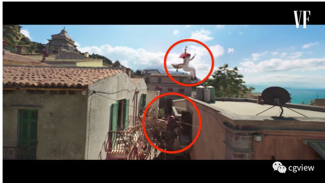 整个Mera屋顶追逐的长镜头由于wire rig 的设置在现场非常的复杂,中间Mera还有个突然的90度转向逃跑,所以设置的时候是由两个特技替身来完成的,分别完成不同方向的跑位。整个场次的视效制作由Method Studios完成。当然在一些场景里面Mara替身的脸和头用素材或者是CG做了替换。