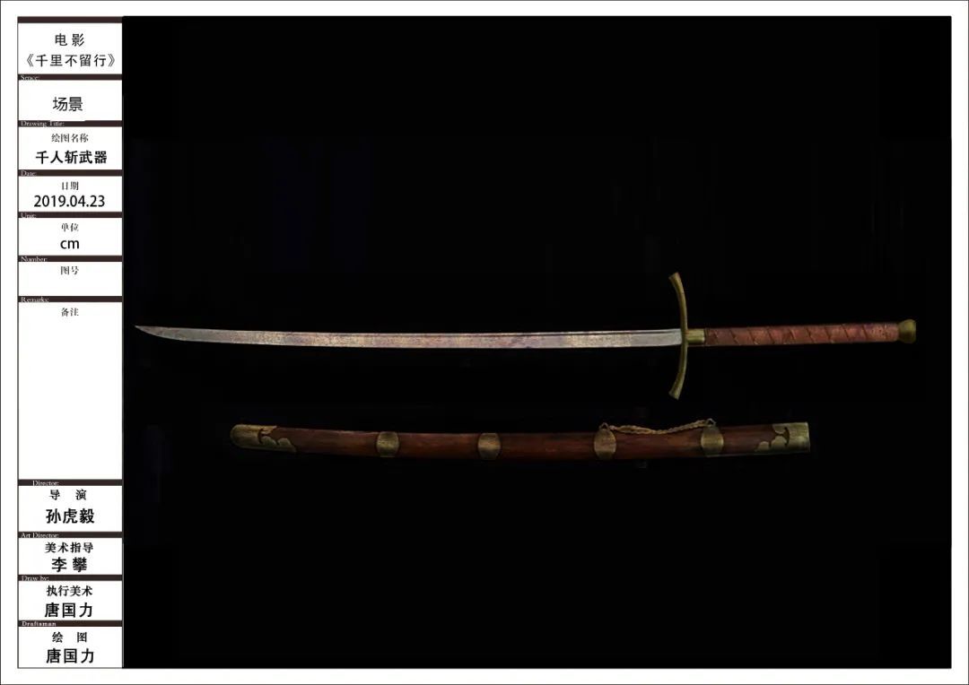 剧中反派用的武器——千人斩的刀。是我设计的,其实就是真实和写实之间的一个平衡产物,这把刀在现实世界中并不存在,它刀身是中国苗刀,但它的护手,是我是从德国大剑中来的灵感。因为德国大剑会通过它的护手做很多攻防转换。这把刀打起来其实是要比一般的短一点的刀更吃力的,因为它特别的长,一米四左右,打起来很费劲,容易伤到对方。但对于设计的奇观性来说,它是合适的。