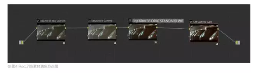 对于 Rec.709 文件,我们先给其加载 Rec709 to REDlogFilm的 LUT, 让其外观转换为REDlogFilm 的 Gamma 曲线和颜色。 再给其加载 Log Kino35 ORIG STANDARD WB 的 LUT。这时图像 颜色与上述 R3D 素材感觉一致, 增加节点适当调整亮度以匹配上述 R3D 镜头。Rec.709 素材调色前后对比如图3所示。