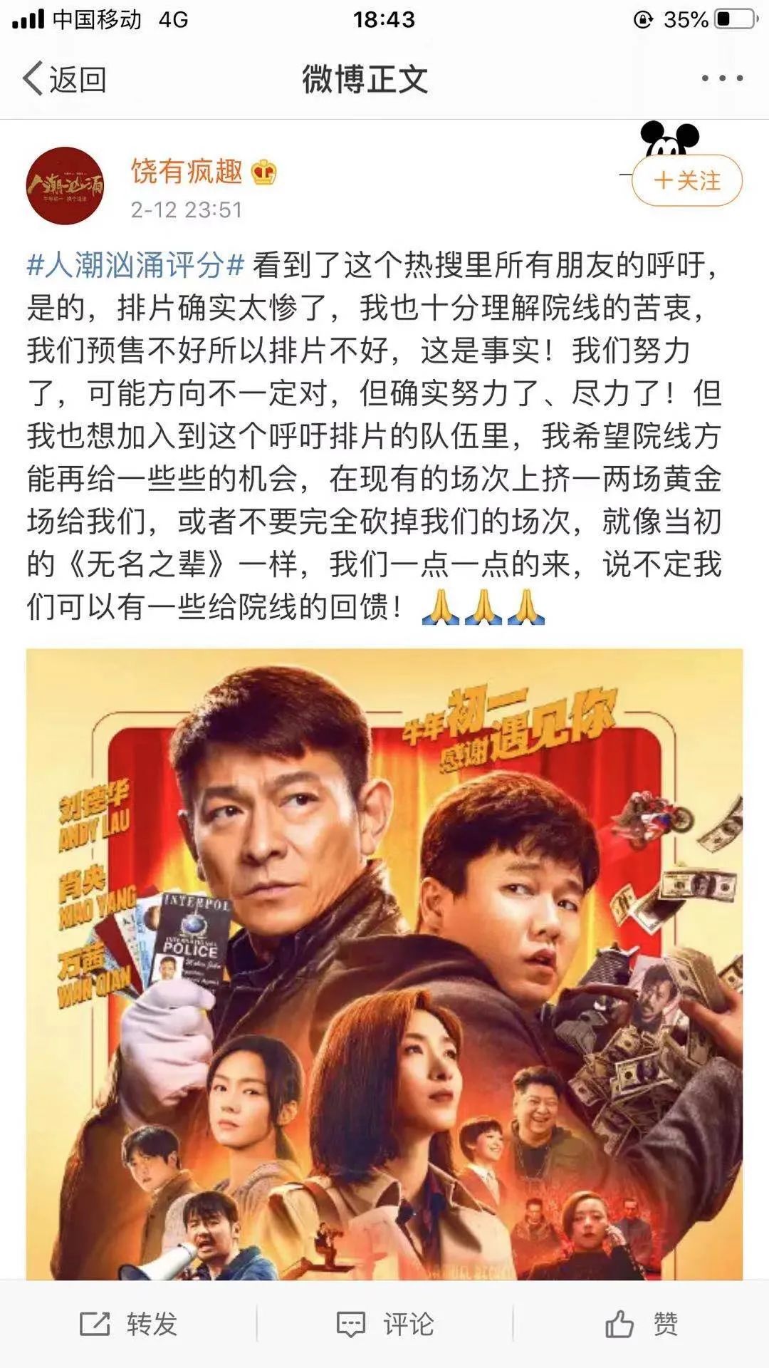 距离《无名之辈》上映两年之后,导演饶晓志带着新片《人潮汹涌》杀入春节档。上映后,口碑与票房反差极大,在春节档这样一个大票仓,七千万票房还不够其他片子塞牙缝的。于是,又发生了导演微博求排片一幕。