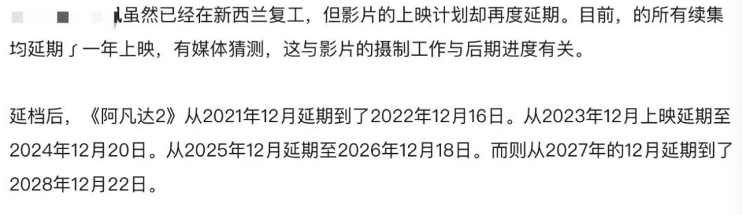 《复仇者联盟4》超越《阿凡达》成为全球票房冠军,卡梅隆亲自送上贺词早在2016年,卡梅隆即向公众表示过,他希望能够以裸眼3D的方式来呈现这部续集作品;然而等待5年之久,没有等来传说中的裸眼3D,却也迎来了经典的再次重映。这不禁令我感到好奇:到底什么时候我们才能看到《阿凡达2》?据悉,由于疫情原因,《阿凡达》系列后续计划的档期都不得不往后推迟一年,而这已不是影片第一次延期。按照目前的安排,观众们将有望于2022年12月16日与《阿凡达2》正式见面。