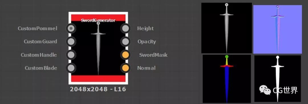 因为铁王座是用无数的剑组合起来的,为了提高工作效率,Phil Liu创建了一个刀剑生成器,可以通过这个生成器定制刀刃、剑柄/剑头、剑的长度,并输出高度、法线、不透明度和遮罩等。具体工程和设置也都展示在下面了。