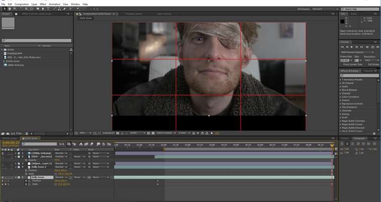 接下来,将平分三分的网格对齐插入到画面中。因为我们在上面的例子看到,大多数的Dolly Zoom里,拍摄的人物都是静止的,而只是后面的空间、景深变化。鉴于上述的,我所以我们要降低处理的范围,所以保证主体在屏幕的位置。这就是为什么我们要插入一个网格。