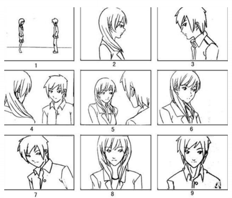 剧情类必定会有对话场景,下图是可遵循的拍摄公式,1全景或中近景交代场景,2-3中近景分别交代人物,4-5过肩镜头交代两人关系及位置,6-9正反打镜头交代对话内容。