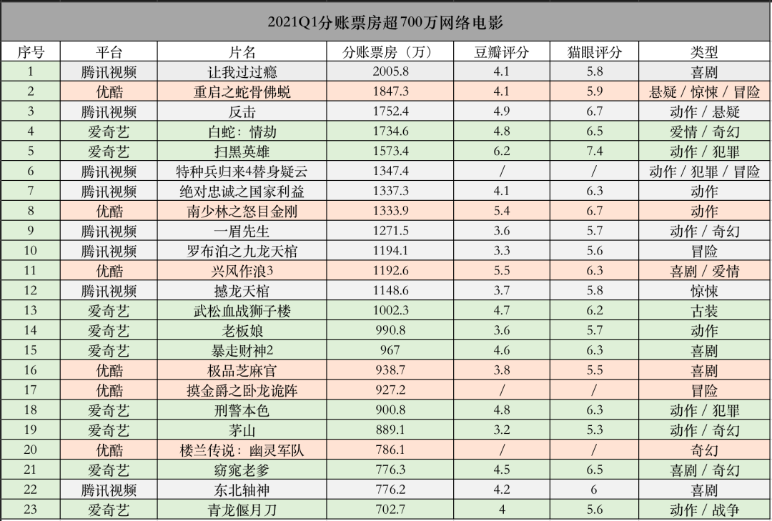而回顾整个Q1,共有23部网络电影分账票房超过700万,13部票房破千万。