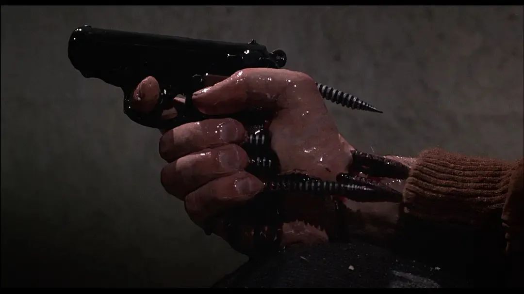 大家也许会以为这是一个相当典型的惊悚片的桥段,但在这里,不同的是这把枪并不是被拿在手上的,而是与手融为一体,更为确切的说,是一个巨大的,手枪形肉瘤,取代了手的位置。