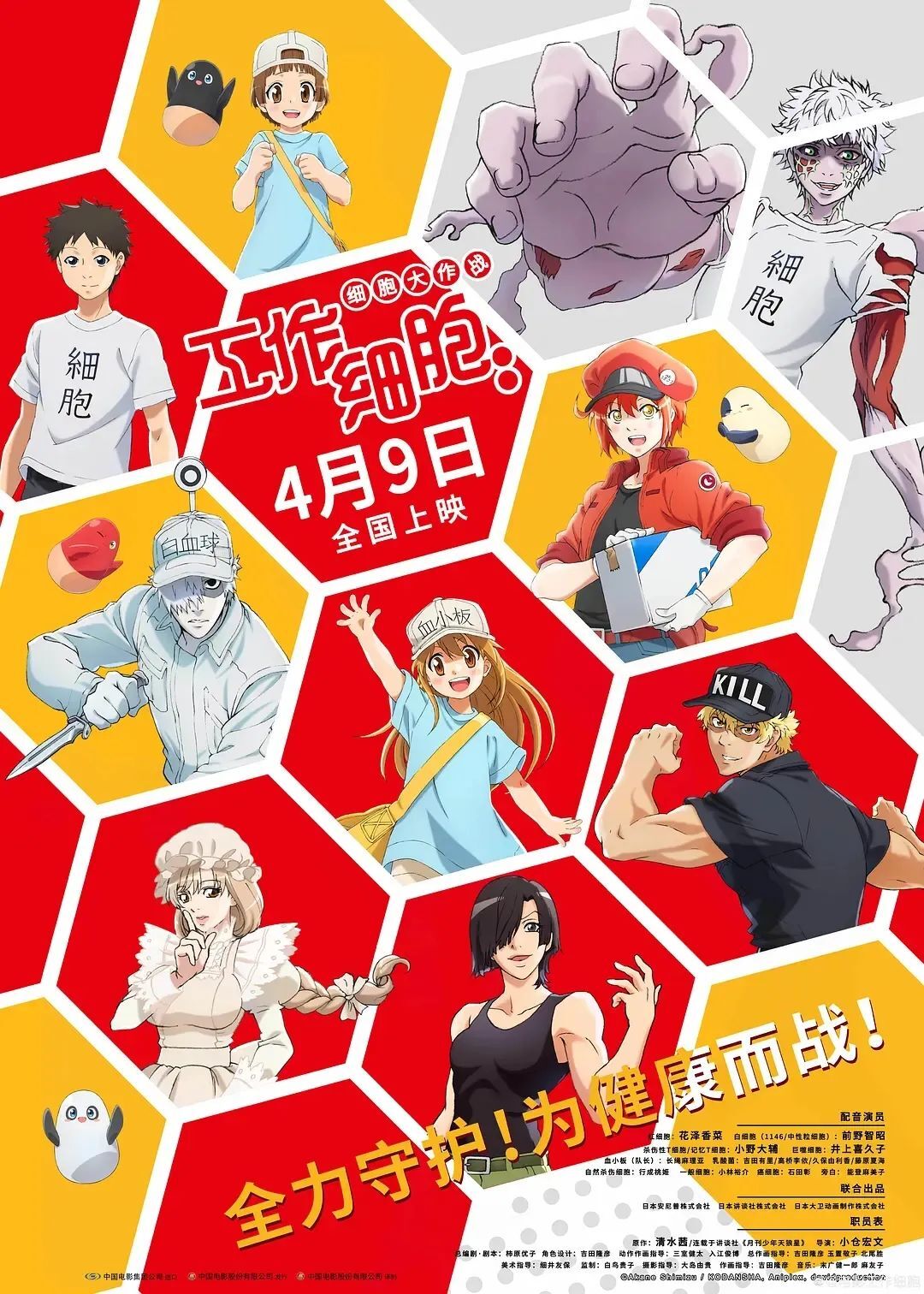 动画自2015年在《周刊少年天狼星》上连载,2018年被改编成了番剧。作为一部硬核科普番,它一上线就强势打破了2018年度追番人数记录。引入国内后,更是成为B站首部追番人数超500万的番剧,如今播放总量已超2亿次。国内上映的是该IP下的首部大荧幕作品,原本也是没想到会上映。顾名思义,它的主角是工作着的细胞,也就是人体内的细胞。众所周知,我们的身体就像一台精妙的仪器,各个器官配合才能维持机体的正常运转。据了解,一个人体内大概有37万亿(37兆)个细胞,它们从早到晚不眠不休地工作——比一般的细胞体型小,却能在血管损伤时集合起来堵住伤口的血小板,还有向其他免疫细胞传达抗原信息的树突状细胞,制定攻击战略的辅助性T细胞,听从辅助性T细胞作战、拥有超强战斗力的杀伤性T细胞等等。这么多细胞名称读起来让人头大,但电影看起来可一点都不枯燥。因为它们都以拟人化的形象在屏幕上出现,并且身上有着人类才拥有的性格特点——红细胞迷糊,白细胞热血,血小板可爱,一般细胞中二……