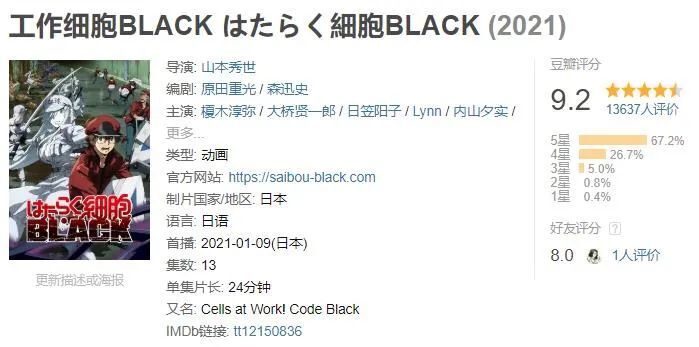 其实最初关于细胞,原作作者清水茜知道的,也仅限于高中课本里那些知识而已。是她正在上学的妹妹对她说:“如果把细胞知识画成漫画,我应该会很容易记住。”这成了整个《工作细胞》系列的灵感来源,也是清水茜创作这个奇妙细胞世界的动力。将生物课本上的知识,变成生动有趣的动画,寓教于乐地带领观众探索人体世界的奥秘。你想过为了保护身体不受细菌侵害,你的细胞们有多努力吗?你每一次划伤了手指,淋了雨着凉,吃坏了肚子,对于那个片儿区的细胞来说,它们都要为你召开紧急会议,制定应对战略并火急火燎地派小分队行动。你不以为意的一场感冒,对他们来说是经历了一场争分夺秒的“世界大战”。前面说了,人身体内的细胞大约有37万亿个;而体内细菌的数量,大约有100万亿。如果把细胞当成一个个有思想有生命的个体来看,就会感受到这个微观世界的宏大。想象一下你一个不小心的擦伤,就有成千上万个“血小板”冲在前线,用自己的身体为你堵住伤口止血。而在第一季第二季之外,《工作细胞》今年还上线了一个暗黑版本——《工作细胞BLACK》,豆瓣高达9.2分。这一衍生系列对于细胞们职场生活的还原,则更加接近“残酷的胞生真相”。