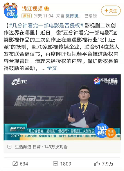在半个月内,影视行业多家生产单位以及行业协会就连发了两份关于短视频版权保护的倡议声明。尽管这两份声明在目前还不具备相应的法律效力,但它们在影视业内与互联网上产生的话题性、争议性却引起了极大的关注和讨论。