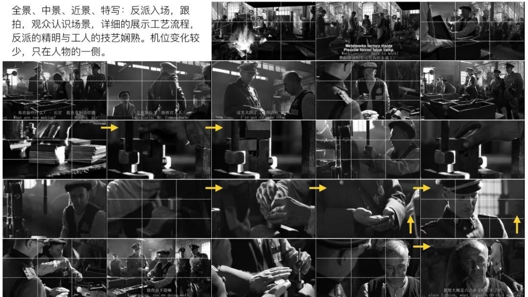全景、中景、近景、特写:反派入场,跟拍,观众认识场景,详细的展示工艺流程,反派的精明与工人的技艺娴熟。机位变化较少,只在人物的一侧。
