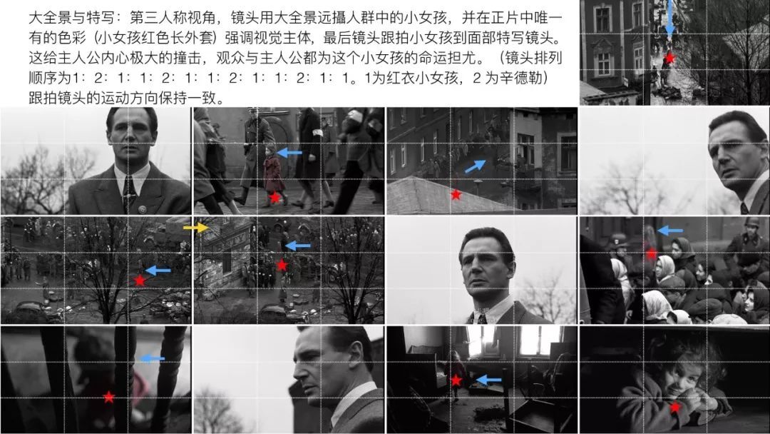 大全景与特写:第三人称视角,镜头用大全景远攝人群中的小女孩,并在正片中唯一有的色彩(小女孩红色长外套)强调视觉主体,最后镜头跟拍小女孩到面部特写镜头。这给主人公内心极大的撞击,观众与主人公都为这个小女孩的命运担尤。(镜头排列顺序为1:2:1:1:2:1:1:2:1:1:2:1:1。1为红衣小女孩,2 为辛德勒)跟拍镜头的运动方向保持一致。