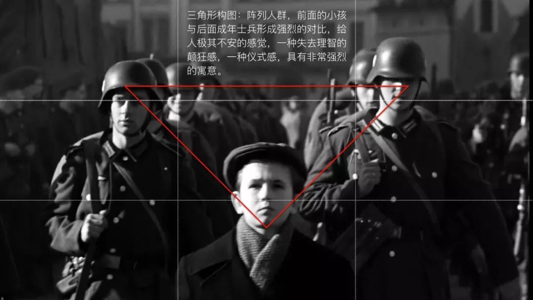 三角形构图:阵列人群,前面的小孩与后面成年士兵形成强烈的对比,给人极其不安的感觉,一种失去理智的颠狂感,一种仪式感,具有非常强烈的寓意。