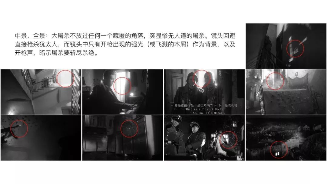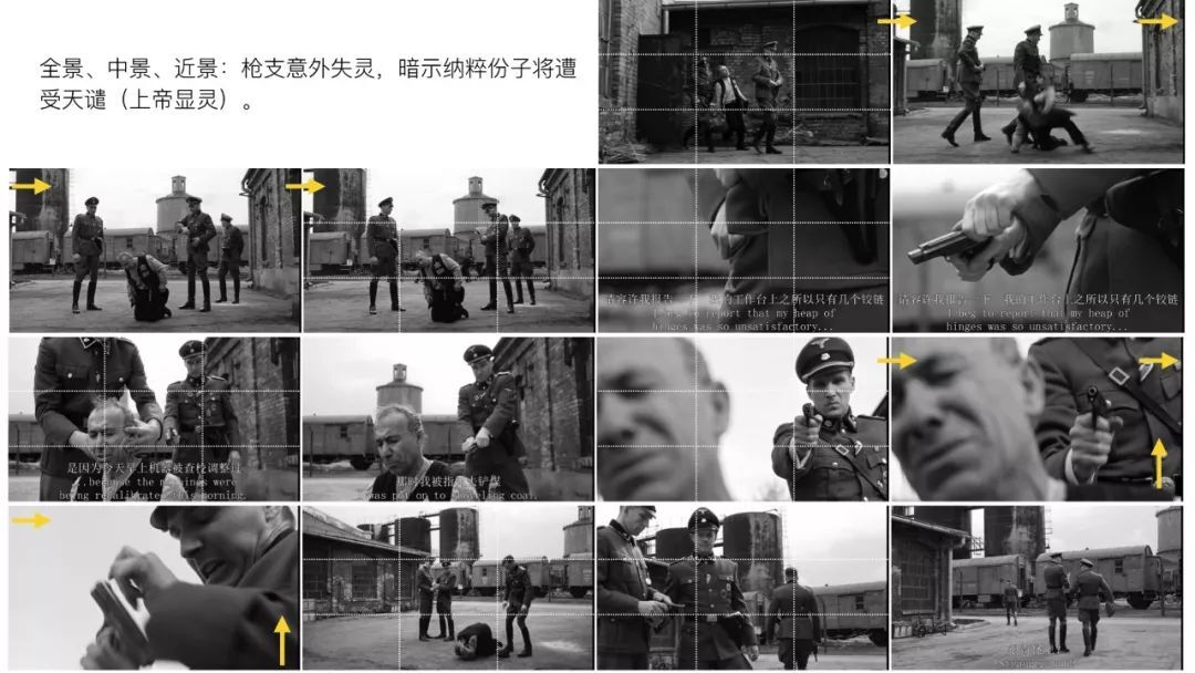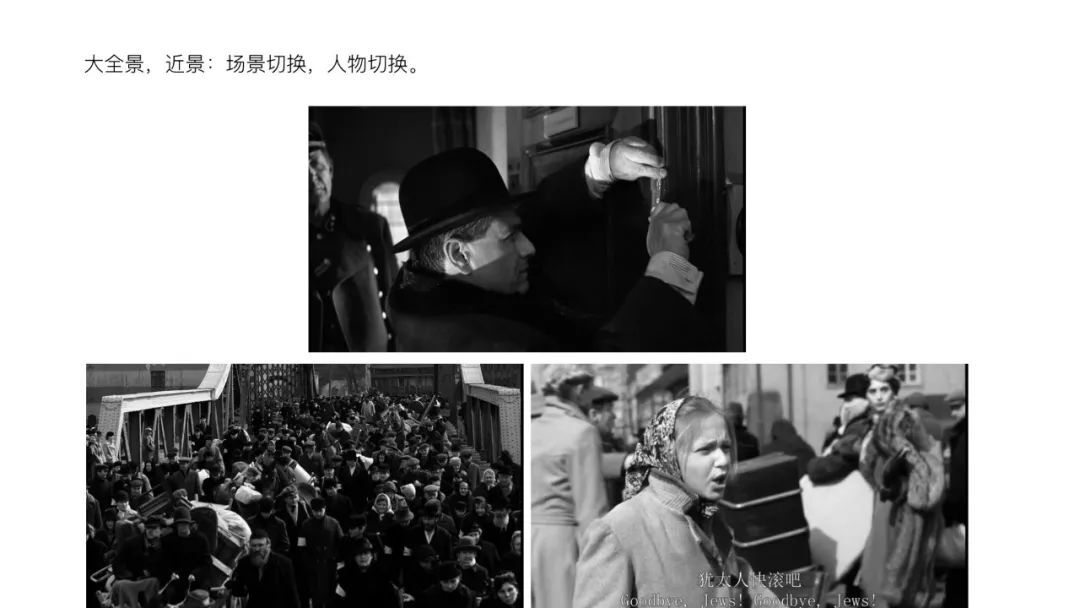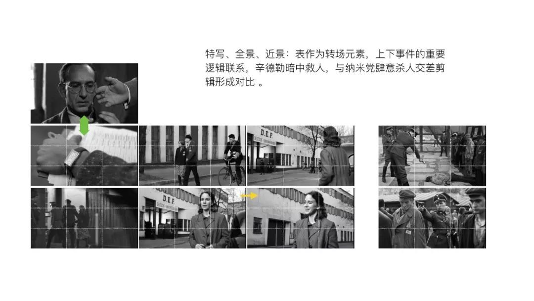 特写、全景、近景:表作为转场元素,上下事件的重要逻辑联系,辛德勒暗中救人,与纳米党肆意杀人交差剪辑形成对比 。