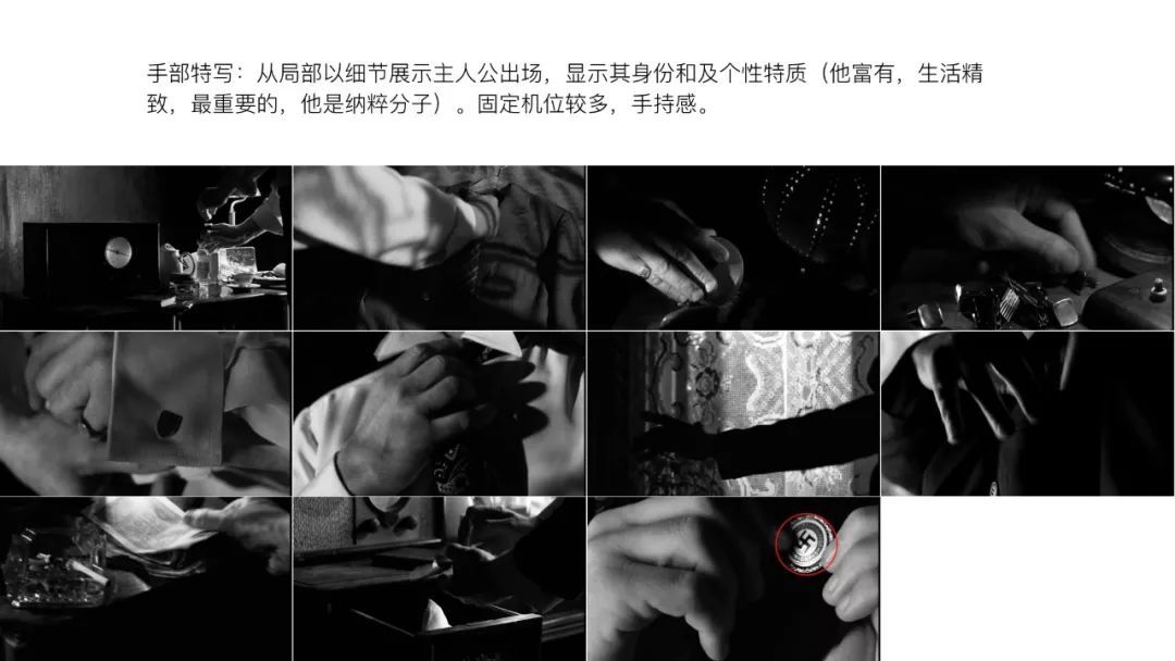 手部特写:从局部以细节展示主人公出场,显示其身份和及个性特质(他富有,生活精致,最重要的,他是纳粹分子)。固定机位较多,手持感。