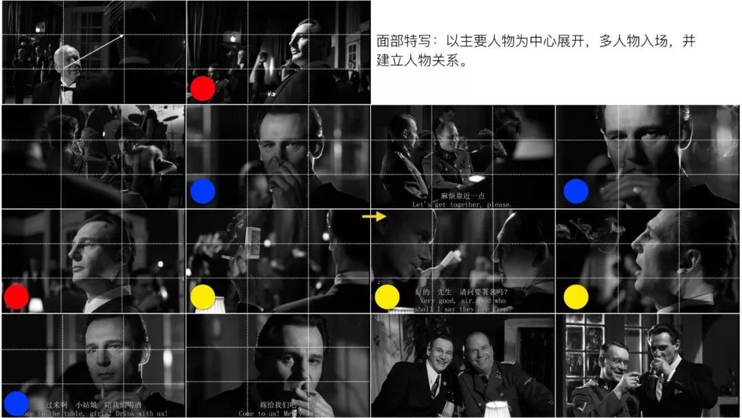 这种就餐、会议多人的场景用镜,很容易给观众造成方位上的困扰,因此,机位不易太频繁的变换,可以采用不同景别来打破机位的单一问题。第一个镜头为一个长镜头跟拍,给观众建立了很好的空间感,通过主人公与不同人的对话建立起关系,镜头紧跟人主公。