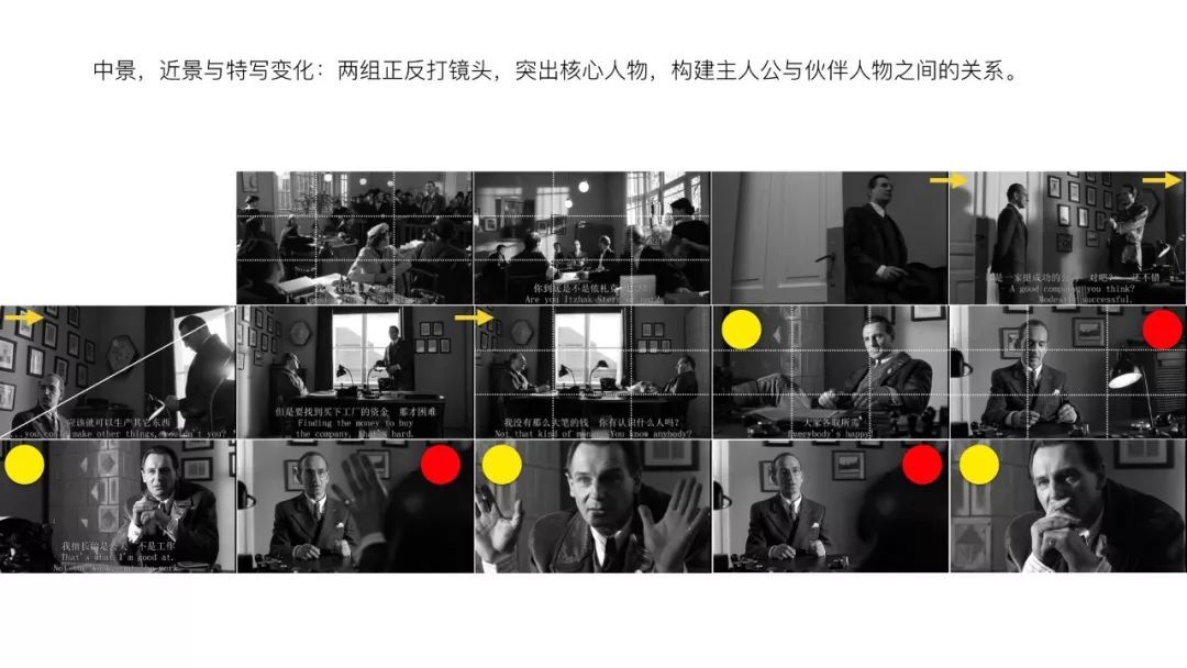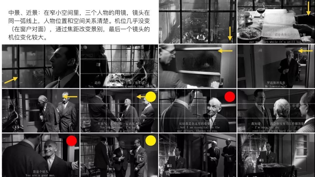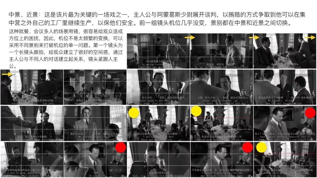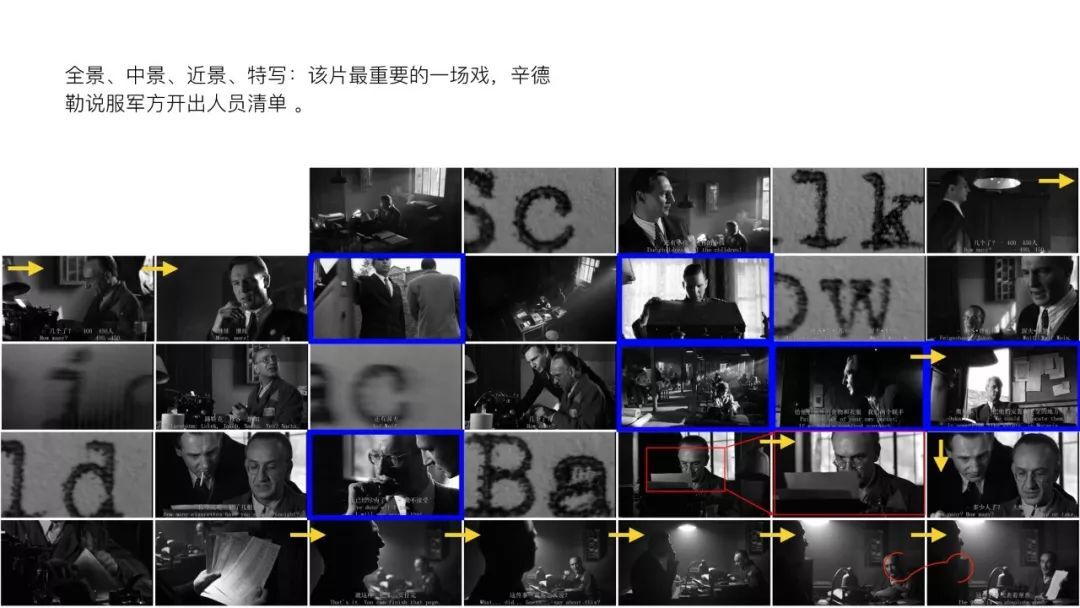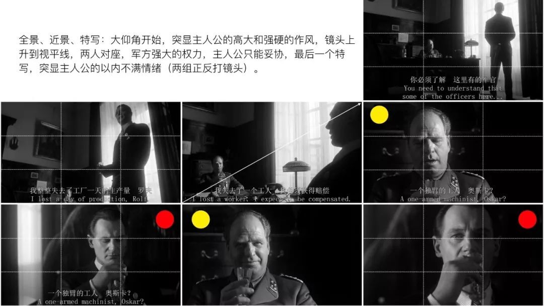 全景、中景、近景、特写:该片最重要的一场戏,辛德勒说服军方开出人员清单 。