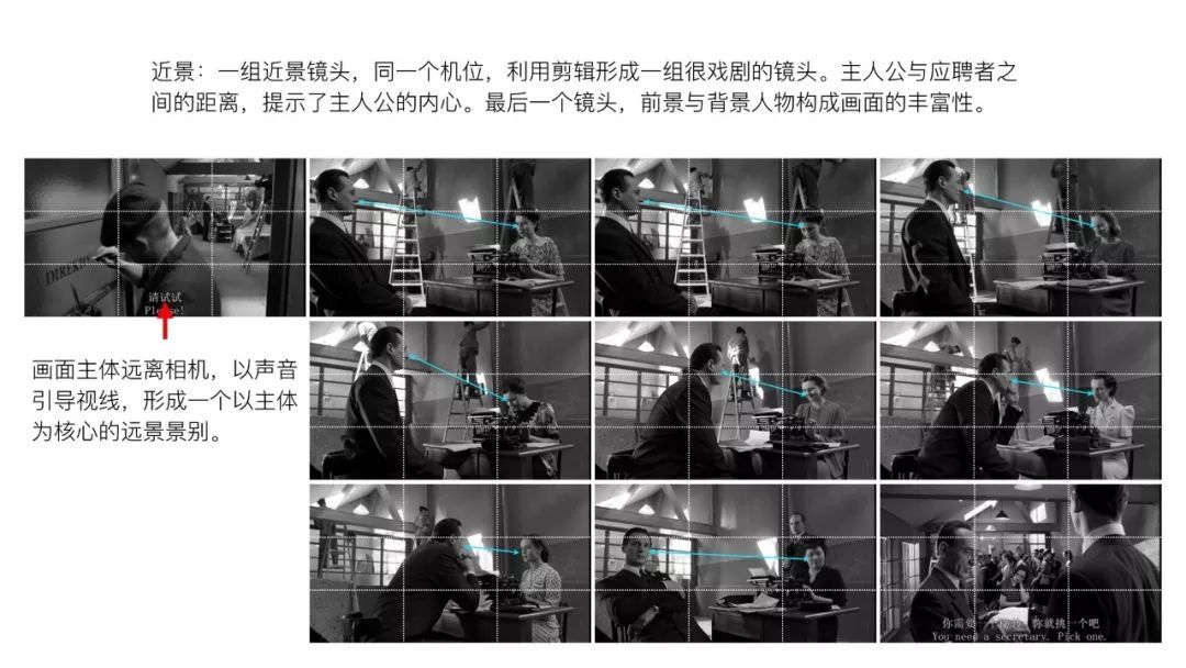 近景:一组近景镜头,同一个机位,利用剪辑形成一组很戏剧的镜头。主人公与应聘者之间的距离,提示了主人公的内心。最后一个镜头,前景与背景人物构成画面的丰富性。