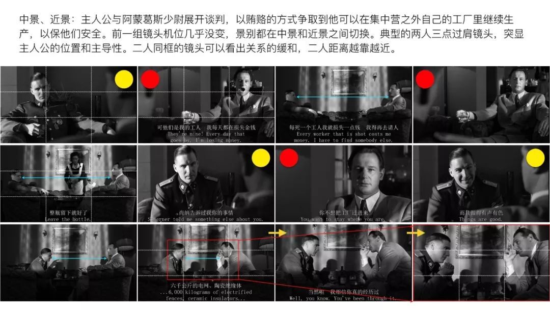 中景、近景:主人公与阿蒙葛斯少尉展开谈判,以贿赂的方式争取到他可以在集中营之外自己的工厂里继续生产,以保他们安全。前一组镜头机位几乎没变,景别都在中景和近景之间切换。典型的两人三点过肩镜头,突显主人公的位置和主导性。二人同框的镜头可以看出关系的缓和,二人距离越靠越近。