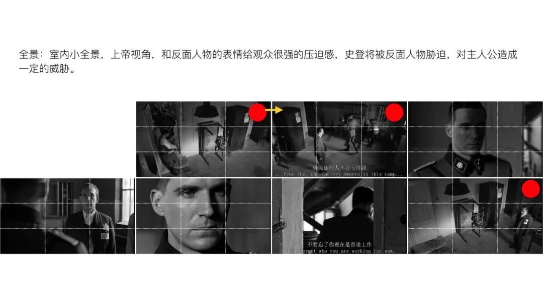 全景、中景、特写:在这个厂房里构建了三个阵营,孤军的辛德勒、工人和纳粹士兵。辛德勒更像是一名斗士在与人数重多的纳粹士兵抗衡,一个正反打+一个正面镜头,突出了斗士的勇敢与无畏。图6大全景,工人占到画面的2/3,其人数众多,暗示他们的胜利;图7,8史登和辛德勒分别与同一个纳粹士兵进行眼神交流,一种无声的抗议,纳粹只好离开。