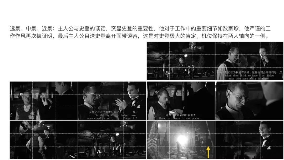 远景、中景、近景:主人公与史登的谈话,突显史登的重要性,他对于工作中的重要细节如数家珍,他严谨的工作作风再次被证明,最后主人公目送史登离开面带谈容,这是对史登极大的肯定。机位保持在两人轴向的一侧。