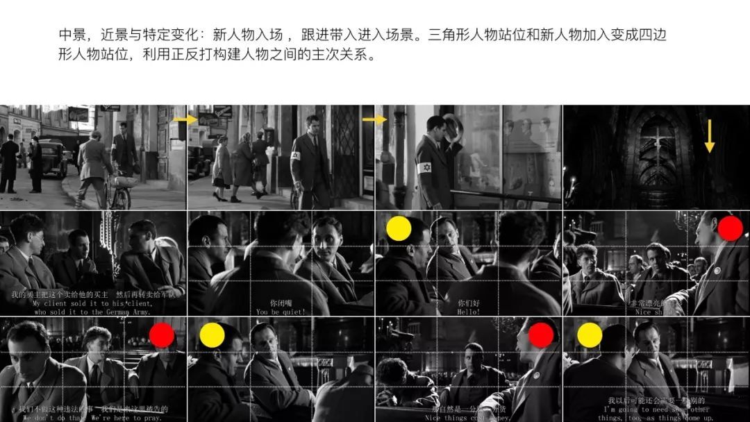 中景,近景与特定变化:新人物入场 ,跟进带入进入场景。三角形人物站位和新人物加入变成四边形人物站位,利用正反打构建人物之间的主次关系。