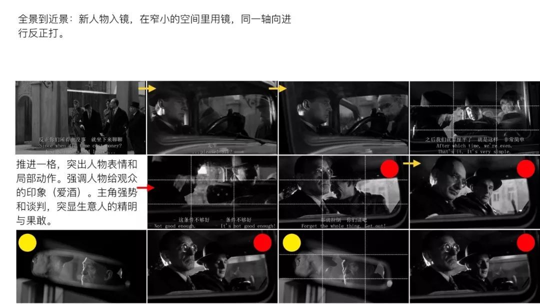 全景到近景:新人物入镜,在窄小的空间里用镜,同一轴向进行反正打。