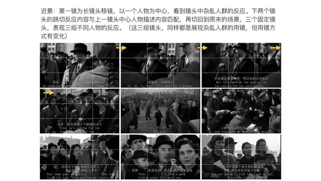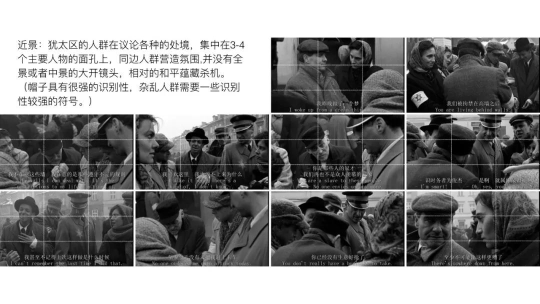 近景:犹太区的人群在议论各种的处境,集中在3-4个主要人物的面孔上,同边人群营造氛围,并没有全景或者中景的大开镜头,相对的和平蕴藏杀机。(帽子具有很强的识别性,杂乱人群需要一些识别性较强的符号。)