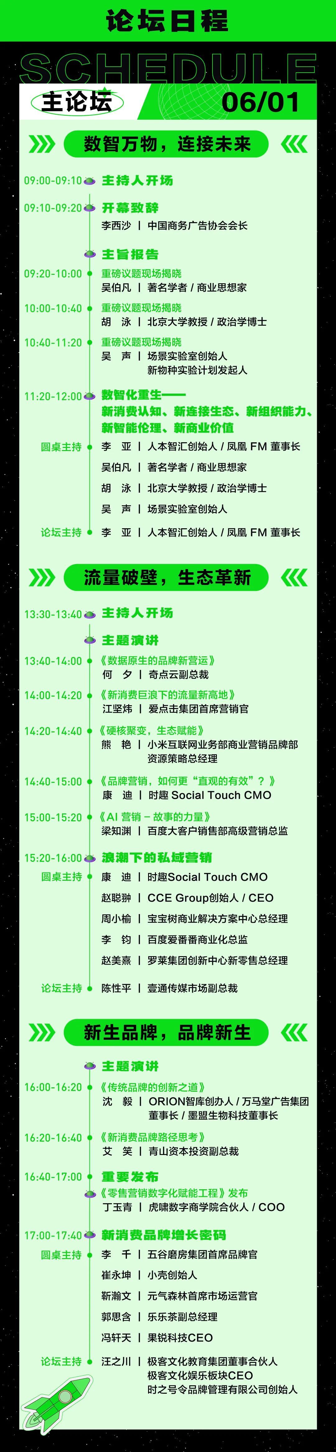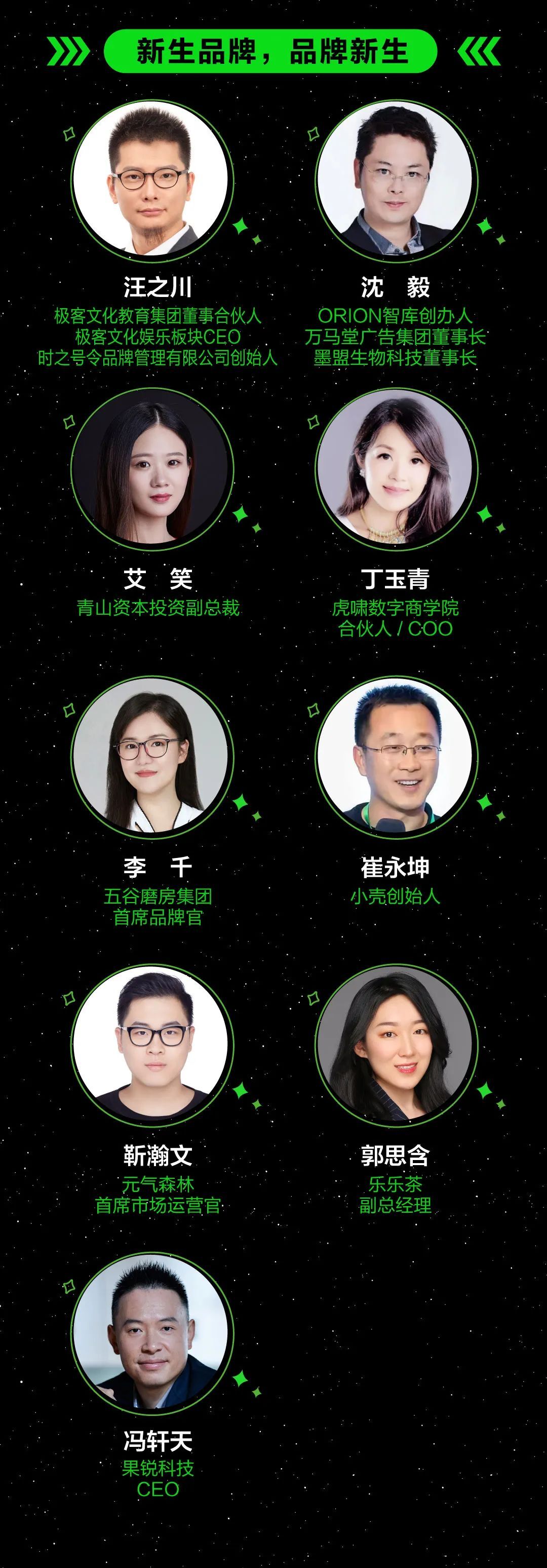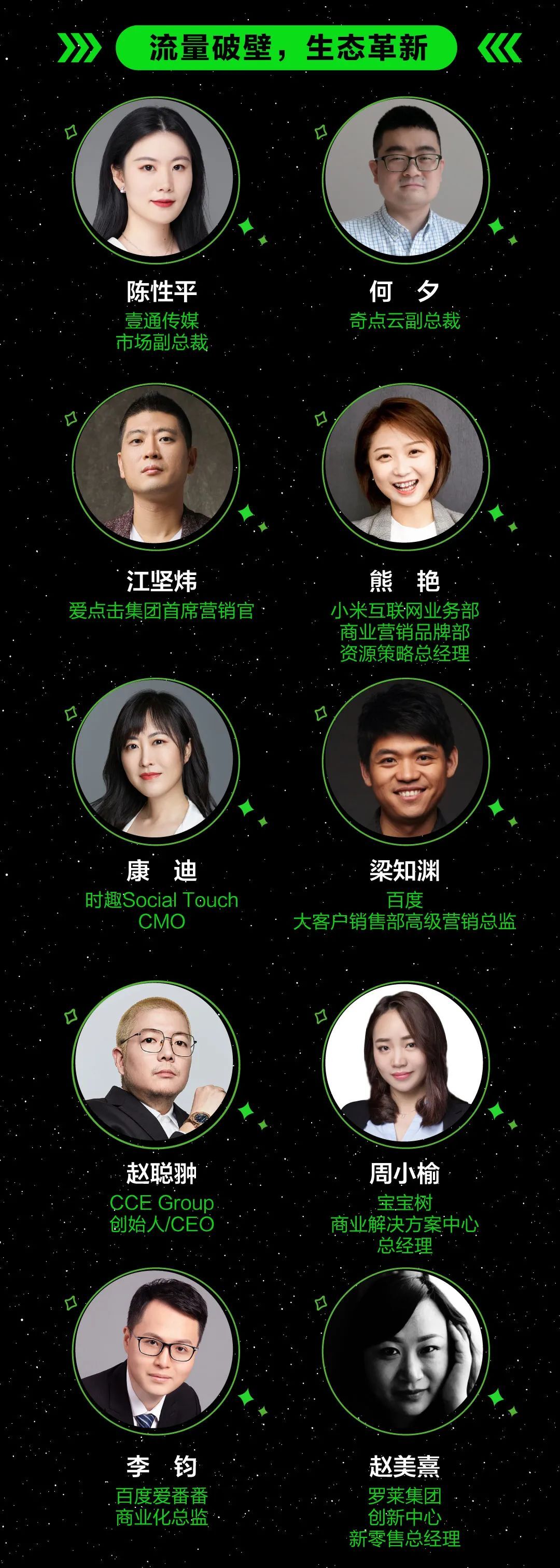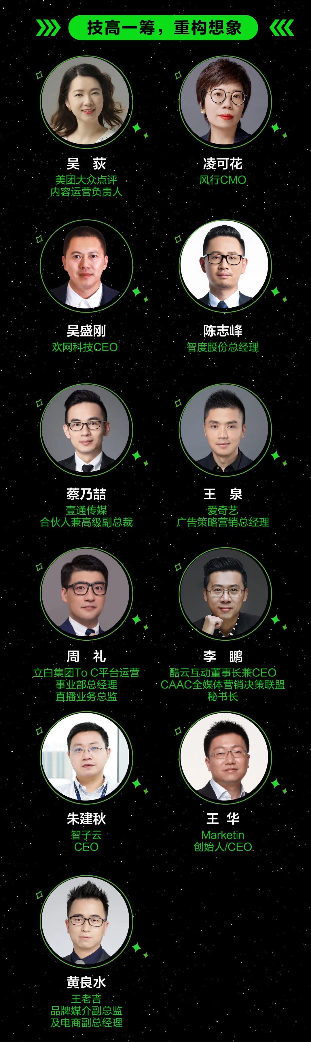 我们设立了包括跨界分享、流量、新消费、内容、技术、效果等六大主题版块,邀请了诸如海尔智家、王老吉、立白集团、元气森林、乐乐茶、罗莱生活集团、五谷磨房、小壳、果锐科技、溪木源、惠达卫浴、恺米切、阿里巴巴天猫精灵等知名品牌,明晰市场变化,洞察市场趋势,与行业各方一同把握未来方向。