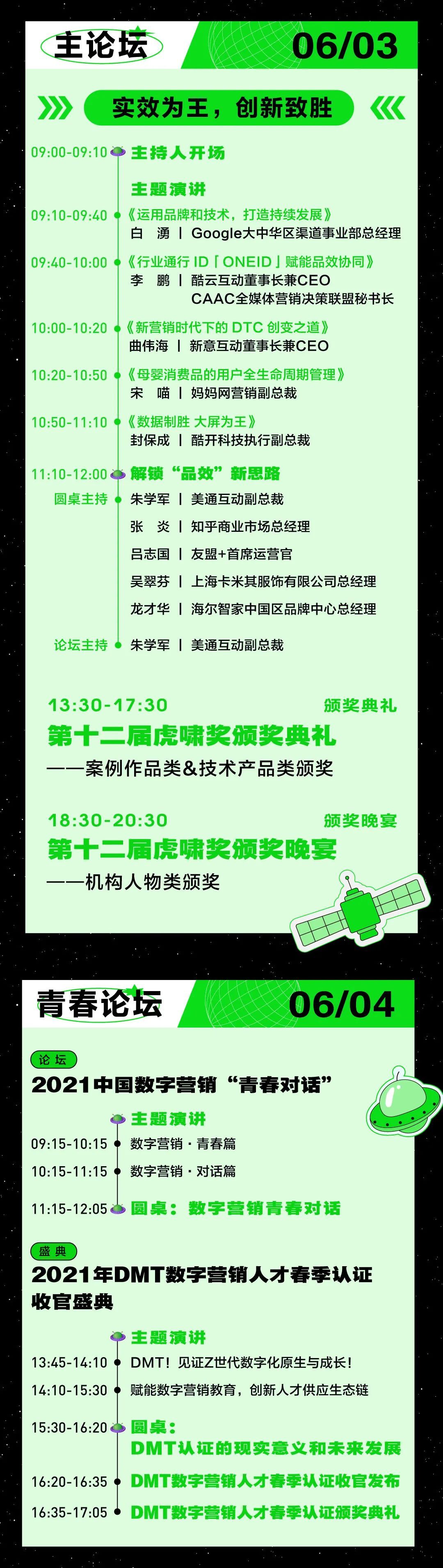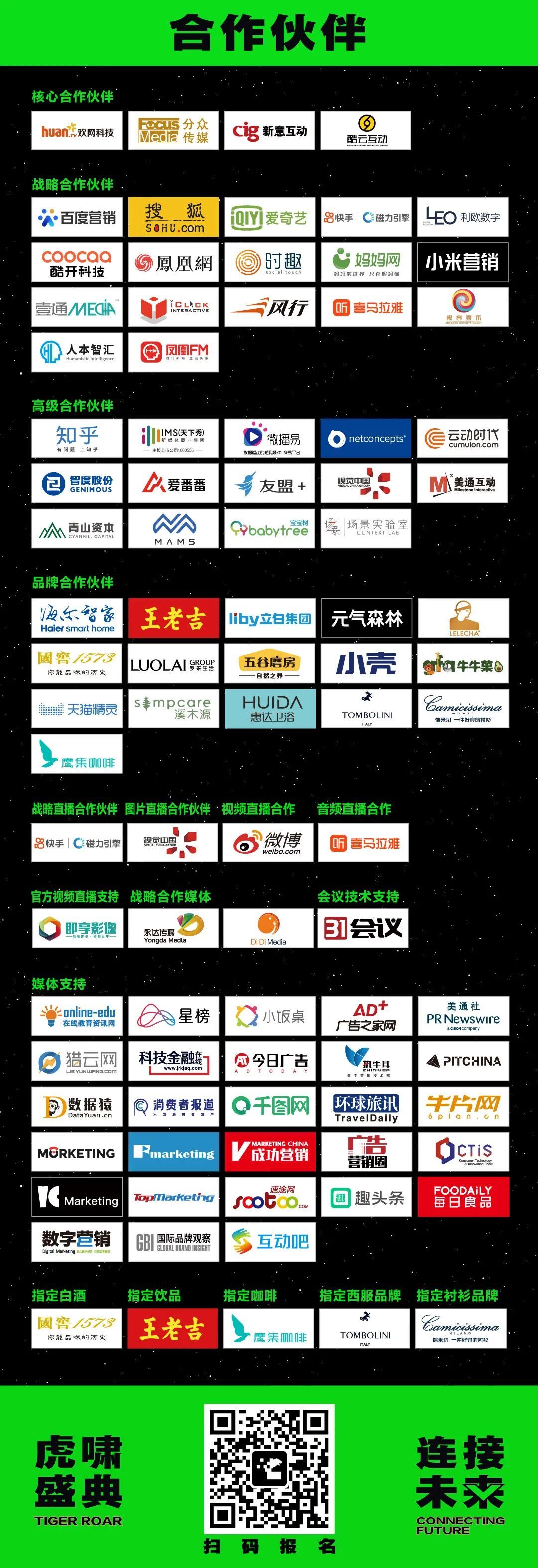 今年的虎啸盛典,依旧由中国数字商业传播论坛、各大平行论坛和虎啸奖颁奖典礼、DMT数字营销人才认证春季收官典礼等组成。