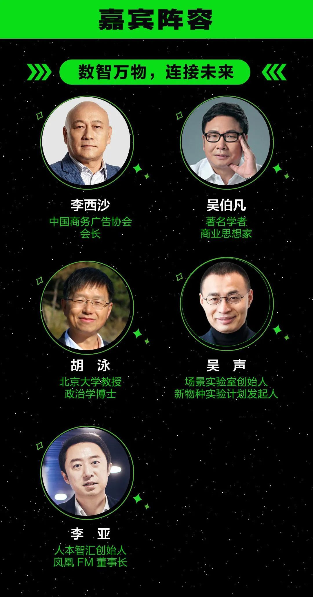 除此之外,在开幕论坛当中,我们重磅邀请到了四位跨领域行业专家,包括著名学者/商业思想家吴伯凡、北京大学教授/政治学博士胡泳、场景实验室创始人吴声及人本智汇创始人/凤凰FM董事长李亚,将带给我们一场跨界视听盛宴。