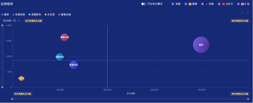 目前来看,喜茶已经坐稳了新茶饮品牌的头部位置,根据时趣洞察引擎对“喜茶”、“奈雪的茶”、“乐乐茶”、“蜜雪冰城”、“茶颜悦色”的品牌横向对比数据中,可以发现“喜茶”处于高内容量高互动量的第二象限区域。