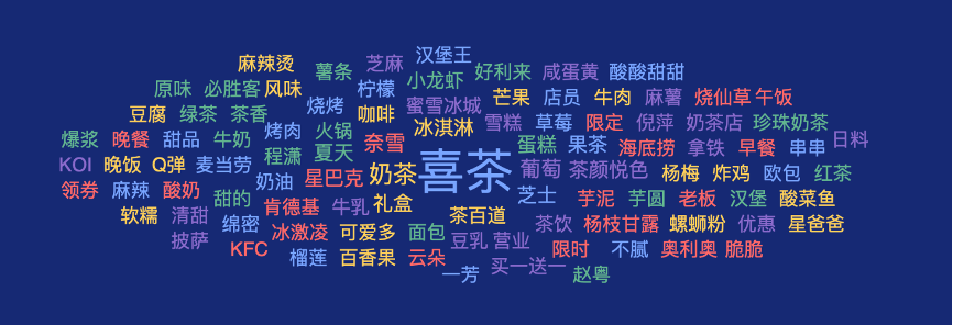 通过时趣极速洞察引擎的数据也可以看出端倪,在2020年5月至2021年5月的品牌词云中,我们可以发现“喜茶”词云内容并不聚焦,甚至相对杂乱,出现了大量其他品牌的联想词。