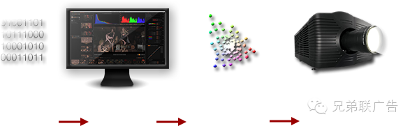 4.投影机。这个过程将成片的色彩转换到投影机本身的色彩空间。任何成片的色彩都不能完整重现,是需要进行投影机本身的色域映射。