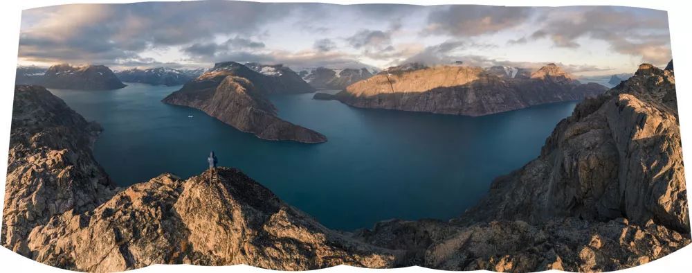 这张全景接片的原图拍摄于格陵兰南部的无人小岛,当时我和队友花了2天时间,从小岛的西部海滩登陆,攀登到东边的峭壁地带。这里是鲜有人知的未知地带,我们也是通过卫星地图的估算,前来探索。