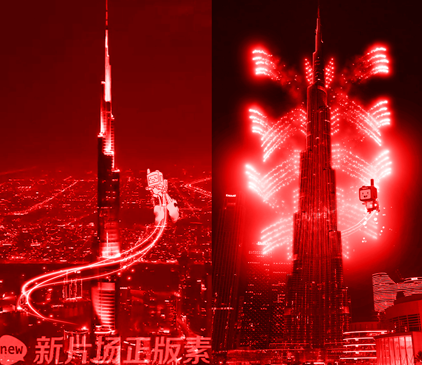 为确保整体品牌调性的统一与高端感,本片在视觉设计上进行了系统规划,尤其在迪拜段落中,实现了科技感、庆典感与人文温度的完美融合。动画元素(小海、喷气装置、光轨、烟花、文字)采用轻量化建模+自然物理模拟,避免“过度CG感”,追求“刚刚好”的惊喜。