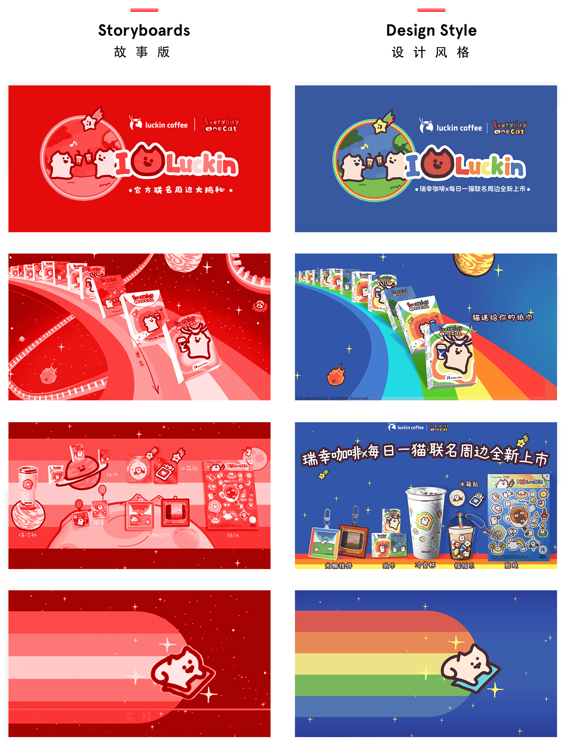 The animation uses "Rainbow" as a visual cue, connecting the adventure from reality to the fantasy universe, fully echoing the core selling point of the collaborative merchandise. The star trajectory extends out as a rainbow ribbon, and the collaborative paper towels fall like dominoes; the Disco golden ball rises, and the light grating pendant changes patterns in the light and shadow; finally, ice water is poured into the cold-changing cup, and the pattern on the cup body instantly "changes", with a cute cat pattern emerging in blue ripples. The universe panel pops up with the collaborative title "Luckin × Daily Cat", and the cute cat "solves the problem" in the form of a mind map, using rainbow lines to disassemble the collaborative happiness formula. Finally, the cute cat shuttles back from the universe to reality, stopping at the neatly arranged collaborative merchandise, calling on the audience to check in at the store.