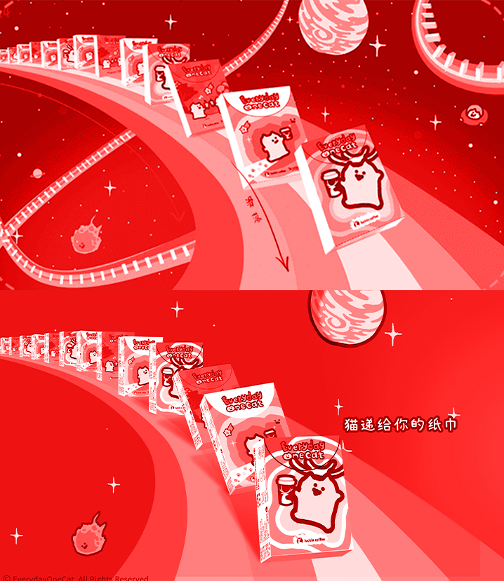 The overall style is a mix of flat design and cyberspace aesthetics. The iconic soft and cute simple lines of Daily Cat perfectly blend with Luckin's modern visual language, retaining the healing sensation of the IP while injecting the vitality of youthful trends. With the rainbow's seven colors as the core color palette, paired with a deep cosmic blue as the base, this high-saturation, high-contrast color scheme not only aligns with the currently popular "dopamine" aesthetic but also highly unifies with the rainbow logo of the "Daily Cat" IP, forming a strong visual memory point. It creates a unique atmosphere of "soft and cute cyberspace". The cold universe and mechanical planets are imbued with a warm texture by cute cats and rainbows, allowing viewers to feel the overwhelming healing sensation beneath the sci-fi shell, accurately meeting the emotional needs of contemporary young people who "seek happiness amidst despair".